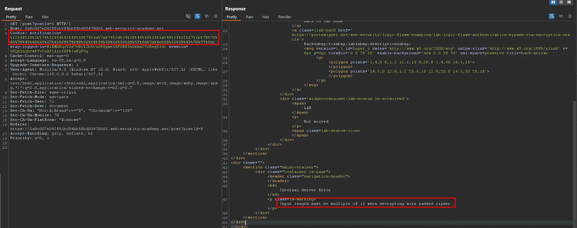 When the modified value is set as the stay-logged-in cookie, the application throws an error: “Input length must be multiple of 16 when decrypting with padded cipher.” This error reveals that the encryption algorithm uses a block cipher (likely AES in CBC mode) that requires the ciphertext length to be a multiple of the 16-byte block size.